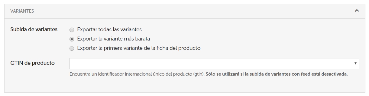 newborn [recién nacidos]infant [bebés]toddler [infantes]kids [niños]adult [adultos]2. Expande el bloque de variantes y selecciona un método para exportarlas. Si deseas descargar todas las variantes (por ejemplo, camisetas de todos los tamaños), se debe seleccionar el elemento correspondiente. Si la primera opción de la ficha de producto es más atractiva, selecciona "Exportar la primera variante".