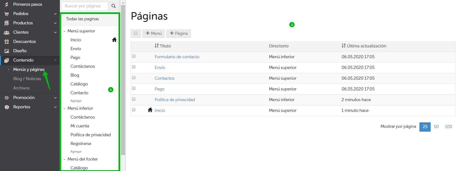 La parte principal de la página (punto 2 en la captura de pantalla) presenta todas las páginas que han sido creadas en la tienda en forma de una tabla: